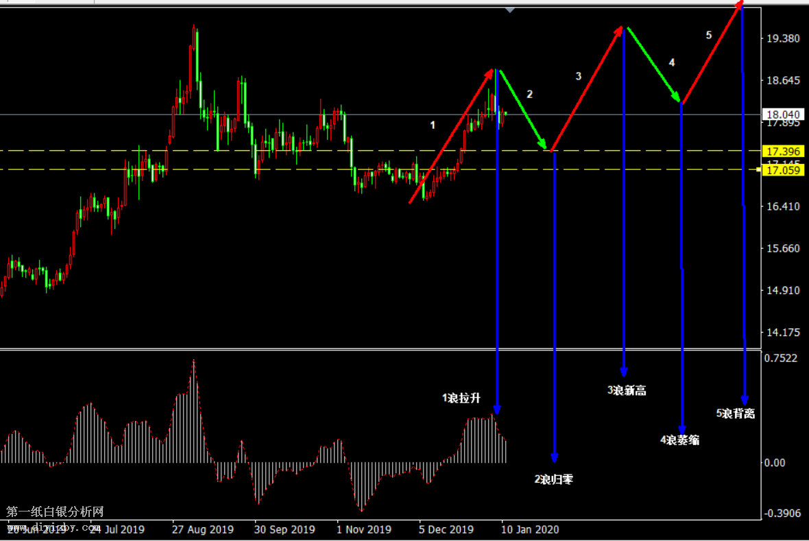 白銀短線策略:(支撐位分批布局多單)。 日線走勢(shì)的主趨勢(shì)5浪上漲將與動(dòng)能指標(biāo)的形態(tài)相結(jié)合判斷。如下圖所示為白銀日線走勢(shì)圖,從大趨勢(shì)形態(tài)分析,我們推測(cè)白銀未來(lái)主趨勢(shì)仍以向上運(yùn)行為主,且將以5浪形態(tài)的模式再創(chuàng)新高的可能性較大。5浪運(yùn)行中所對(duì)應(yīng)的動(dòng)能指標(biāo)也將發(fā)生不同的走勢(shì)變化,圖中藍(lán)色箭頭所示分別為1~5浪頂?shù)讓?duì)應(yīng)的動(dòng)能指標(biāo)的狀態(tài),我們給出如下動(dòng)能指標(biāo)口訣:1浪拉升,2浪歸零,3浪新高,4浪萎縮,5浪背離。即主趨勢(shì)的第1浪拉升出現(xiàn)后,動(dòng)能指標(biāo)將發(fā)生強(qiáng)烈的跟隨性拉升;主趨勢(shì)的第2浪回調(diào)出現(xiàn)后,往往將出現(xiàn)動(dòng)能指標(biāo)歸零軸的現(xiàn)象;主趨勢(shì)的第3浪出現(xiàn)后,動(dòng)能指標(biāo)將順勢(shì)創(chuàng)出新高;主趨勢(shì)的第4浪回調(diào)發(fā)生后,動(dòng)能指標(biāo)已經(jīng)逐漸顯示出萎縮跡象;主趨勢(shì)第5浪結(jié)束時(shí),動(dòng)能指標(biāo)往往已經(jīng)開(kāi)始背離。近期投資者可同時(shí)結(jié)合動(dòng)能指標(biāo)形態(tài),來(lái)推斷2浪回調(diào)的運(yùn)行狀況。