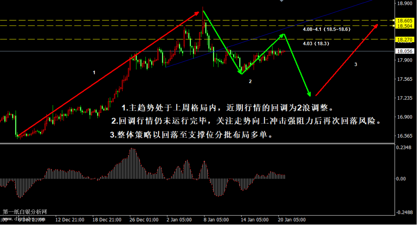 今日下方關鍵支3.9(17.65)、3.83(17.4)、3.76(17.05)。今日上方關鍵阻力4.03(18.3)、4.09(18.6)、4.16(18.9)、4.33(19.6)。 提示:技術僅僅是基于概率論和統計學的一種綜合分析手段,絕非預測。所以技術分析是在考慮做好止損的情況下去博取大概率事件,投資不可過于迷信技術分析。(短線操作請一定做好止損,一旦被損,代表分析師基于概率和統計的技術分析不適用于當前行情) 另外,由于紙白銀價格是國際銀價換算而來,而換算過程中涉及到人民幣對美元匯率的變化,即使在國際銀價不變化的情況下,如果人民幣貶值或升值,也會導致紙白銀價格出現變動。因此,我們的分析只采用最新的國際銀價對應的人民幣白銀價格,如與過去分析價格有出入, 投資者應知曉其原因。 1、文中價格為紙白銀價格,括號內為國際銀價,投資者可雙向參考。 2、以上價格為工商銀行買入價,即紙白銀低價。進倉點位要再加點差(各銀行點差不一),出倉則不要。 3、第一紙白銀給出的所有建議僅供投資者參考,不作為下單依據,作者不持有白銀,也不計劃買入。觀點僅供參考,不構成投資建議,風險自擔。 4、北京時間09:00發布此文章。 5、上一交易日白銀價格分析情況:(1月20日)白銀短線有望小幅反彈 但2浪回調或未完全結束