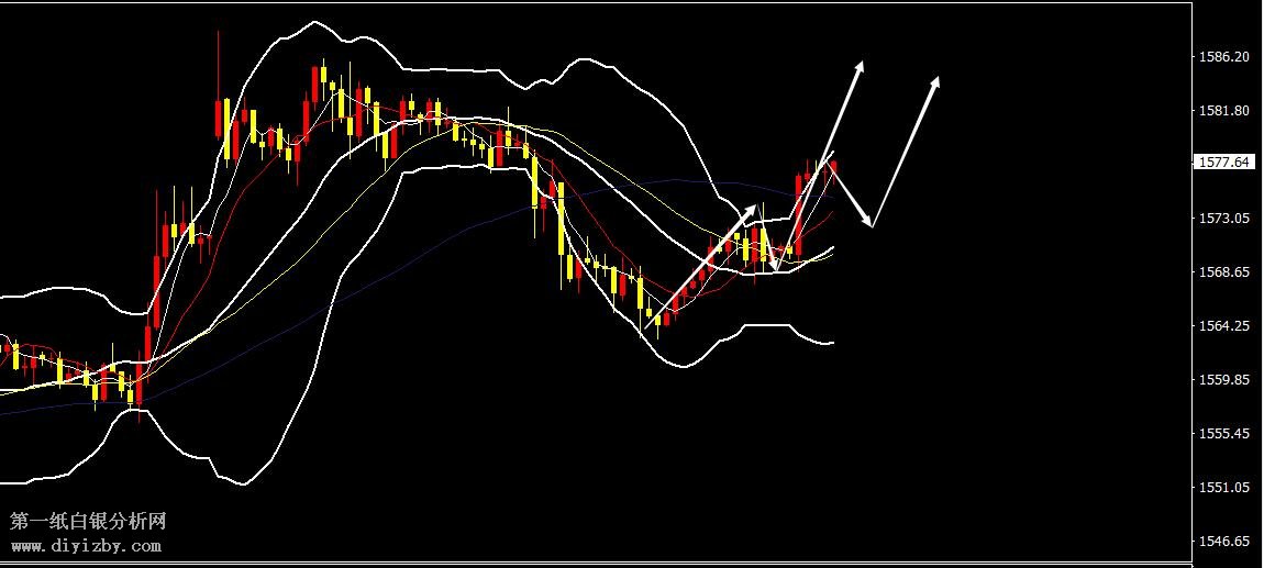 黃H4走勢圖分析,黃金隔日早盤下探1563美金企穩震蕩上漲,四小時圖布林帶目前整體平行發散運行。黃金隔日下探1563美金企穩震蕩上漲,最高反彈觸及1578美金附近,成功突破了隔日早盤1570美金下跌起點位置,走勢偏強震蕩。黃金今日下方支撐關注1571美金,上方進一步看漲1588 1597美金,整體思路延續看漲。
