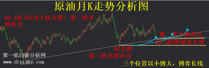 周線級別;金價雖大跌承壓,但仍維持在上升通道趨勢中,各指標雖轉為空頭信號,但10周期線及布林帶通道仍對金價產生支撐,故此,下方需關注兩個位置博取較大看漲,一個則是目前的1550-1555美元支撐位置,另一個則是還未觸及的10周期支撐位置1535-1530美元。跌破這一最后支撐則放棄看漲,并看跌至千五下方行情。