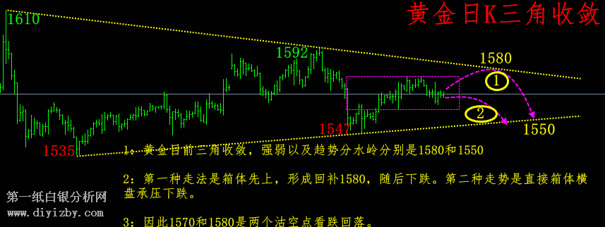 日K之中,我們需要注意幾個細節(jié):第一,日K的指標(biāo)屬于頂背離,反彈屬于回補,回補之后繼續(xù)沽空,這是首選。回補的位置1577-1580這里最大。第二,日K的中軌支撐1562上下(誤差1-2美金),跌破日K中軌才能完成下跌延續(xù)。第三,日K暫時性的是走的頂背離,BOLL傾斜向上,61.8%的比例反彈壓制在1590上下。