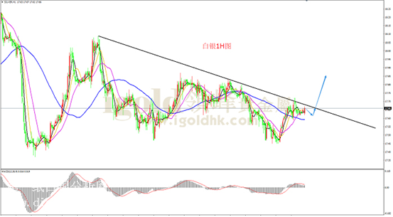 白銀昨日早間開盤后一路上行,最高上漲至17.72附近。從1H周期走勢結(jié)構(gòu)看,白銀昨日一舉突破MA5、MA10、MA20、MA60均線壓力,MA5、MA10、MA20均線金叉向上,并穿越M60均線壓力,發(fā)出多頭信號。日內(nèi)操作上方重點關(guān)注18.09附近下降趨勢線壓力,突破下降趨勢線,白銀將打開上方空間。下方重點管制MA60均線支撐,跌破此位置白銀有再次轉(zhuǎn)空的可能。由于目前1H周期趨勢偏多,日內(nèi)操作可在17.60附近嘗試多單,目標(biāo)上看17.85附近。