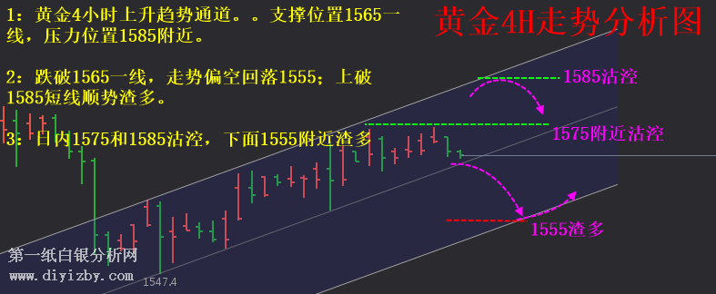 如上圖所示,這是在上周分析的黃金的走勢(shì)圖。其中在1560附近得到支撐之后,短線(xiàn)上黃金的小幅度避險(xiǎn)推升黃金走出上揚(yáng),因此,第二檔壓力位置1585附近是重點(diǎn)布局沽涳的位置。
