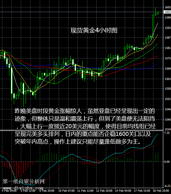 從現貨黃金4小時圖看,昨晚美盤時段黃金漲幅驚人,雖然亞盤已經呈現出一定的跡象,但整體只是溫和震蕩上行,但到了美盤便無法阻擋,大幅上行一度接近20美元的幅度,使得目前均線組已經呈現完美多頭排列,日內的重點能否企穩1600關口以及突破年內高點,操作上建議只能盡量逢低做多為主。