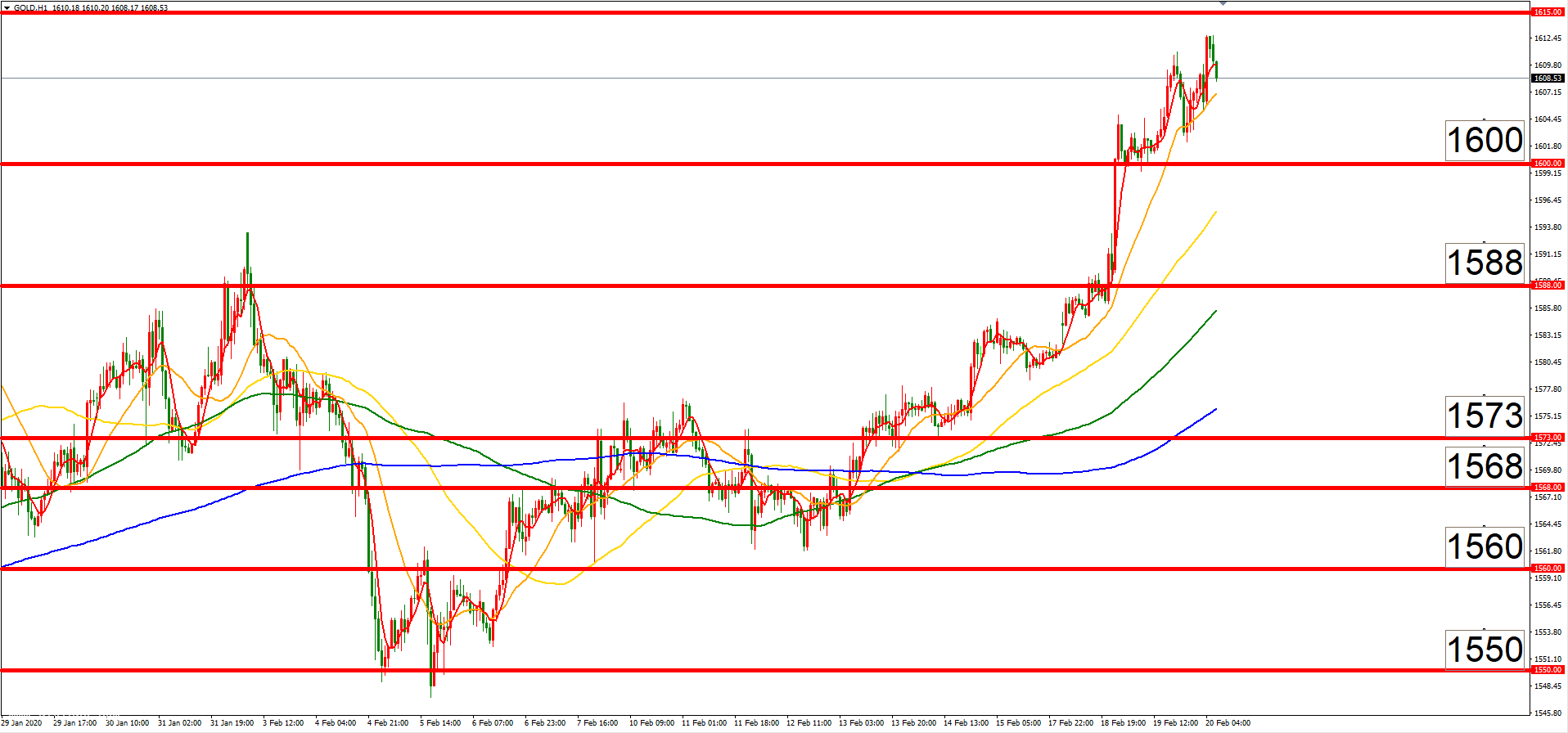 周三(19日)避險情緒的攀升持續刺激著金價的上漲,主因仍由于疫情對全球經濟所帶來的負面影響,使得金價再度創下近期新高價位,最高來到1612美元/盎司。另一方面風險資產也持續的走高,歐美股市的上漲也意味著市場投資人仍是樂觀看待后市,預期疫情對全球經濟的影響將可能是短暫的。后續須持續留意風險資產與避險資產的資金動向,勢必會出現強勢的一方,若屆時市場投資人信心持續回籠,資金回流至風險資產,避險資產就要留意價格回落的風險。