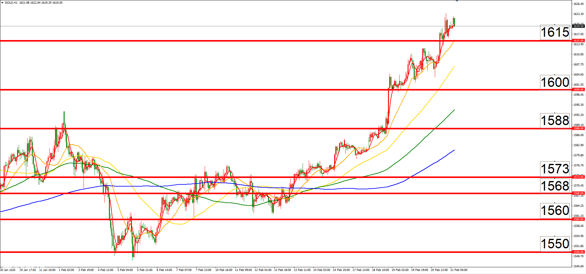 周四(20日)黃金延續多頭漲勢,并且持續創下波段新高價位,最高來到1623美元/盎司。由于國際間風險事件頻傳,如新型冠狀肺炎、美伊地緣政治等事件,持續推動著避險情緒的上升,使得金價再度刷新近七年來的高點。而近期因疫情的沖擊造成許多經濟體如日本、歐元區等地區,使得其貨幣持續的貶值。而后續須留意各國央行是否會針對此風險事件做出應對的措施,將是市場投資人須留意的重點。