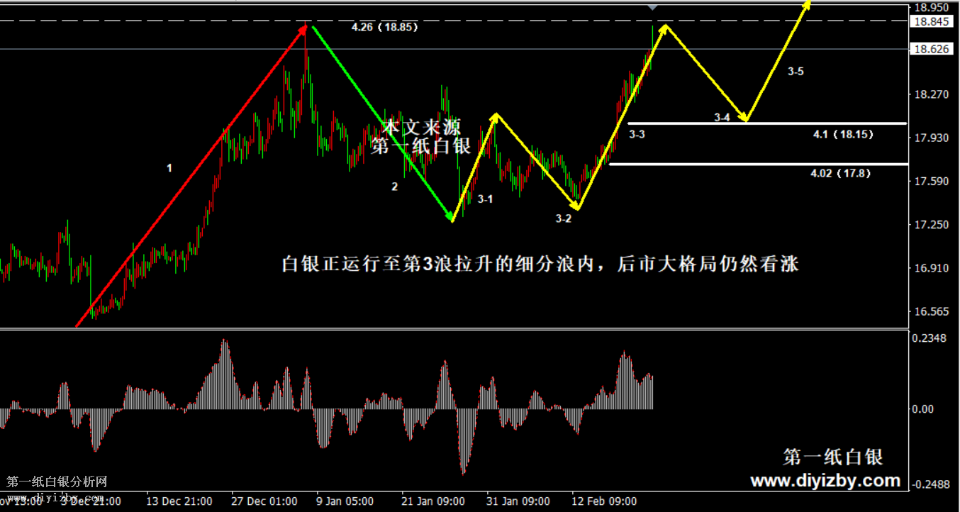 今日下方關鍵支4.1(18.15)、4.02(17.8)。今日上方關鍵阻力4.26(18.85)。 提示:技術僅僅是基于概率論和統計學的一種綜合分析手段,絕非預測。所以技術分析是在考慮做好止損的情況下去博取大概率事件,投資不可過于迷信技術分析。(短線操作請一定做好止損,一旦被損,代表分析師基于概率和統計的技術分析不適用于當前行情) 另外,由于紙白銀價格是國際銀價換算而來,而換算過程中涉及到人民幣對美元匯率的變化,即使在國際銀價不變化的情況下,如果人民幣貶值或升值,也會導致紙白銀價格出現變動。因此,我們的分析只采用最新的國際銀價對應的人民幣白銀價格,如與過去分析價格有出入, 投資者應知曉其原因。 1、文中價格為紙白銀價格,括號內為國際銀價,投資者可雙向參考。 2、以上價格為工商銀行買入價,即紙白銀低價。進倉點位要再加點差(各銀行點差不一),出倉則不要。 3、第一紙白銀給出的所有建議僅供投資者參考,不作為下單依據,作者不持有白銀,也不計劃買入。觀點僅供參考,不構成投資建議,風險自擔。 4、北京時間09:00發布此文章。 5、上一交易日白銀價格分析情況:(2月21日)白銀處于新一輪上漲 趨勢行情中分批布局多單