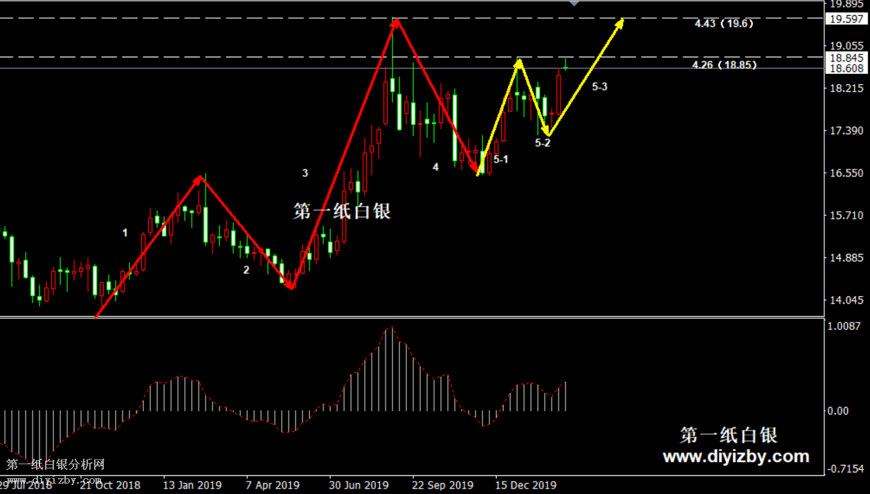 白銀短線策略:(主趨勢看漲,分批布局多單)。 我們將格局放的更大一些,這將對未來白銀大趨勢的運行更加明朗。如下圖所示為白銀周線走勢圖,2019年白銀運行了圖中紅色箭頭所示的1-4浪的走勢形態。2020年,銀價正處于黃金色箭頭的第5浪中期上漲結構中,且目前行情已經運行至中線5-3浪的走勢之中。更具形態推測,5-3浪全部運行完畢后,走勢勢必突破前期高點的4.26(18.85),并有望朝著4.43(19.6)的2019年高點附近靠近。故而以中期角度而言,白銀的上行空間仍然較大,投資者以分批布局多單的方式操作即可。