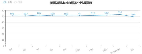 周五公布的美國2月Markit服務業PMI初值為49.4,低于市場預期53;制造業PMI初值為50.8,低于市場預期51.5.(美國2月Markit綜合PMI自2013年10月以來首次低于50的榮枯分界線,服務業PMI自2016年2月以來首次低于50的榮枯分界線)