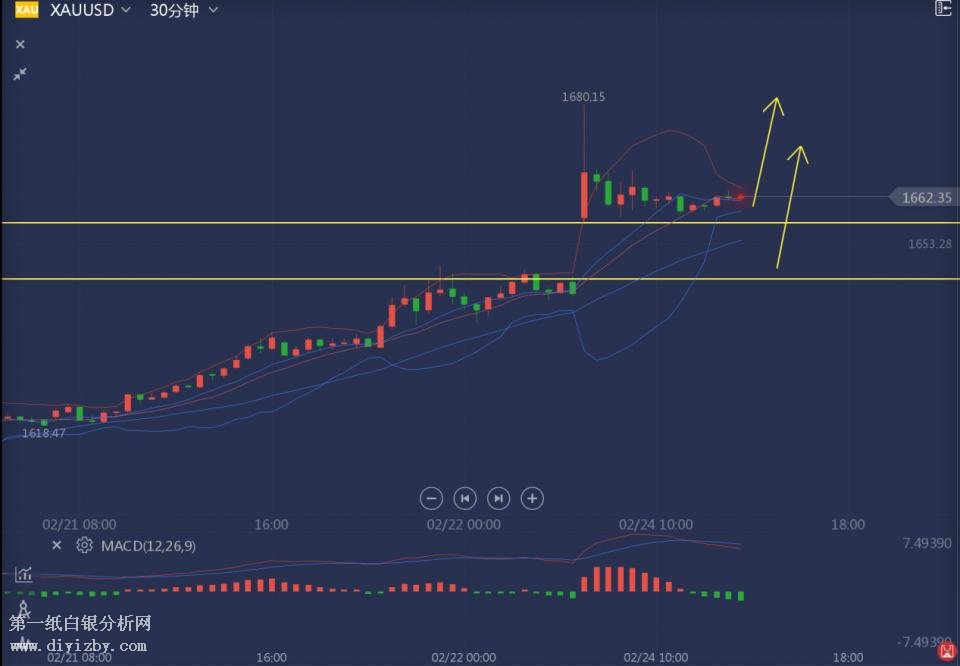 如圖,金價在小時級別,沖高突破之后,下方1657和1645成為了關鍵性的支撐,但有一點,MACD出現了高位死叉,那么今天突破1680可能有點夠嗆,最起碼力度上有困難,但二次沖高的可能性不排除,可以借著1657附近先博一次多,如若回落缺口,那么今天將以震蕩收盤,記得前兩天就出現過同樣的事情,跳空之后經過整理直接拉升,而回撤反而會導致上升的勢頭削弱。
