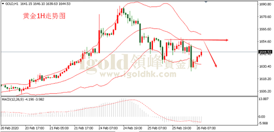 后市行情預計會走高位震蕩的節奏。從目前一小時走勢圖來看,布林帶三軌開口向下,MACD零軸下方動能柱具備進一步下跌的動能。日內操作上建議高空為主低多為輔。關注上方昨日高點1656-1658附近的阻力作用,反彈至此位置遇阻后,可以逢高布局空單。