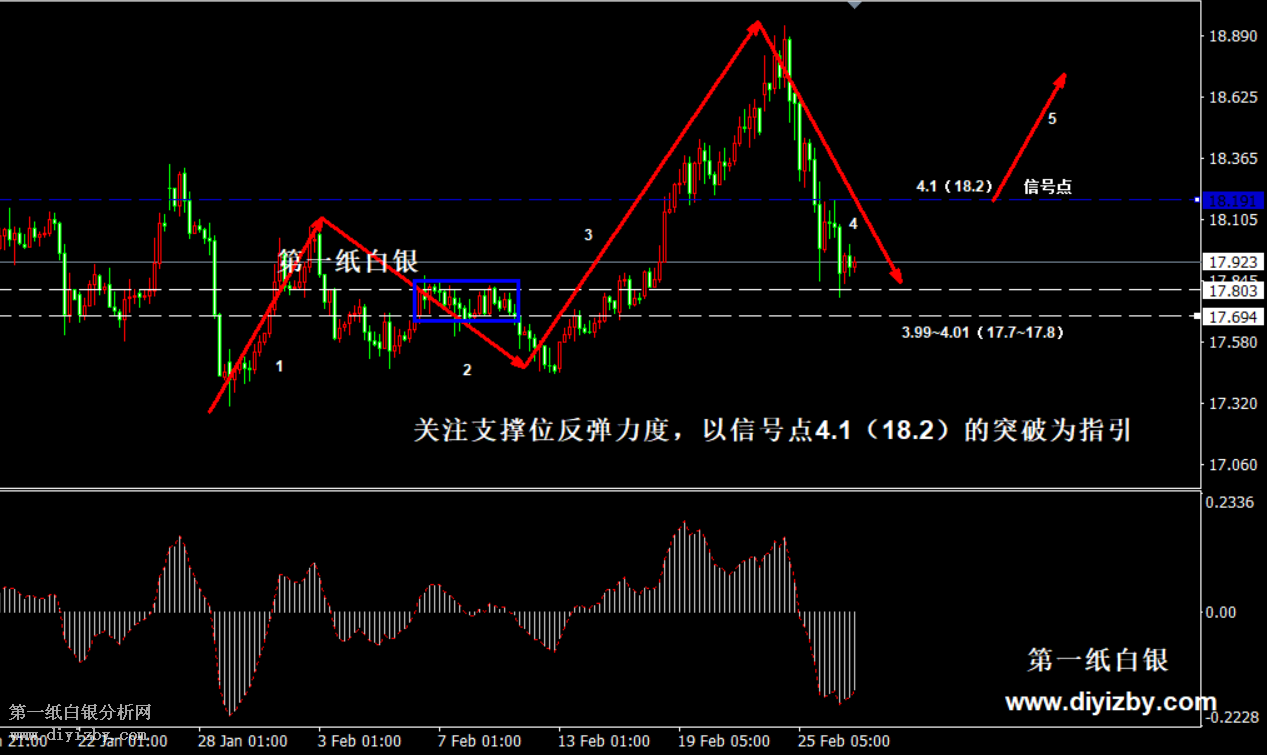 今日下方關鍵支3.99~4.01(17.7~17.8)。今日上方關鍵阻力4.1(18.2)、4.2(18.65)、4.42(19.6)。 提示:技術僅僅是基于概率論和統計學的一種綜合分析手段,絕非預測。所以技術分析是在考慮做好止損的情況下去博取大概率事件,投資不可過于迷信技術分析。(短線操作請一定做好止損,一旦被損,代表分析師基于概率和統計的技術分析不適用于當前行情) 另外,由于紙白銀價格是國際銀價換算而來,而換算過程中涉及到人民幣對美元匯率的變化,即使在國際銀價不變化的情況下,如果人民幣貶值或升值,也會導致紙白銀價格出現變動。因此,我們的分析只采用最新的國際銀價對應的人民幣白銀價格,如與過去分析價格有出入, 投資者應知曉其原因。 1、文中價格為紙白銀價格,括號內為國際銀價,投資者可雙向參考。 2、以上價格為工商銀行買入價,即紙白銀低價。進倉點位要再加點差(各銀行點差不一),出倉則不要。 3、第一紙白銀給出的所有建議僅供投資者參考,不作為下單依據,作者不持有白銀,也不計劃買入。觀點僅供參考,不構成投資建議,風險自擔。 4、北京時間09:00發布此文章。 5、上一交易日白銀價格分析情況:(2月26日)白銀短線迎來回踩調整 中期看漲格局仍然不變