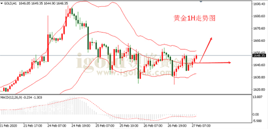 目前依然處于日線大區間震蕩的節奏中。從目前一小時走勢圖來看,布林帶三軌有即將向上開口的跡象,MACD零軸下方的動能柱在逐漸縮短,出現底背離,日內有望進一步震蕩上行。操作上建議逢低做多為主,關注一小時布林帶中軌1646附近的支撐作用,回踩此位置止跌企穩后,可以逢低布局多單。