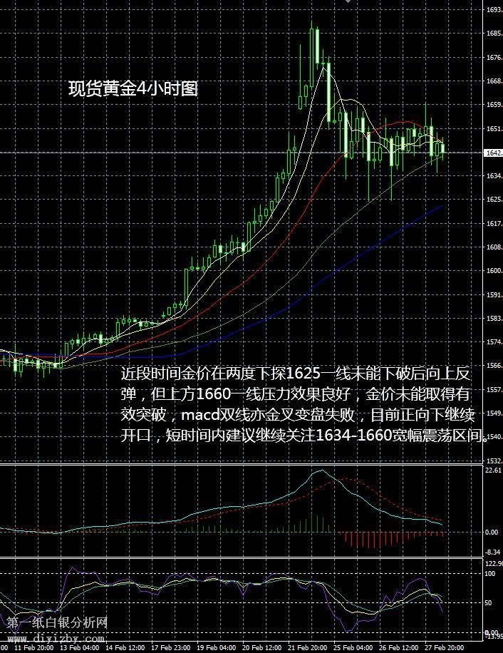 從現貨黃金4小時圖看,近段時間金價在兩度下探1625一線未能下破后向上反彈,但上方1660一線壓力效果良好,金價未能取得有效突破,macd雙線亦金叉變盤失敗,目前正向下繼續開口,短時間內建議繼續關注1634-1660寬幅震蕩區間。