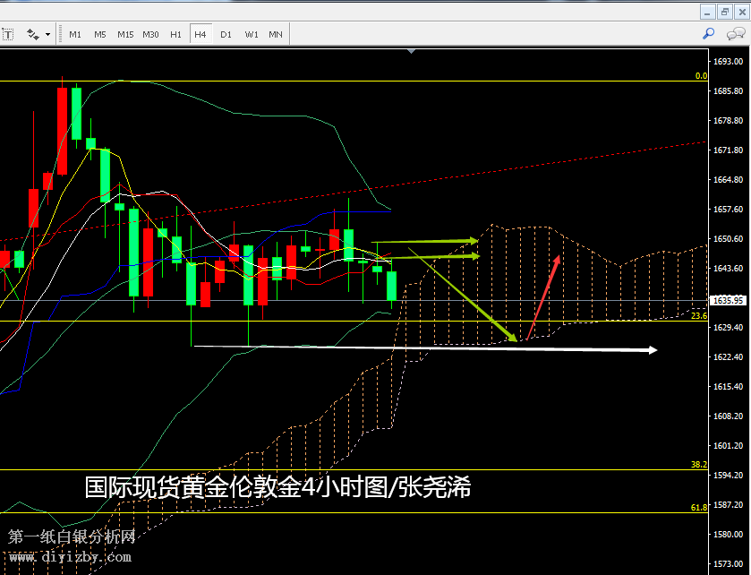 4小時(shí)級(jí)別;金價(jià)處于布林帶中軌下方震蕩運(yùn)行,處于縮口狀態(tài),暗示近日將會(huì)有大波動(dòng)來(lái)臨。另外,金價(jià)運(yùn)行臨近云帶,進(jìn)云是必然的了,故此張堯浠云層理論看,仍有再探周低點(diǎn)1625美元的動(dòng)能和空間。故此1643-1645美元附近阻力可為空單看跌。后至低點(diǎn)支撐位轉(zhuǎn)看反彈。