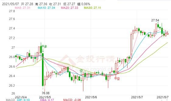 本月5月7日,本交易日現貨白銀開盤價報27.27美元/盎司,截止發稿銀價報27.34美元/盎司,最高觸及到27.54美元/盎司,最低觸及到27.21美元/盎司,漲幅了0.26%。