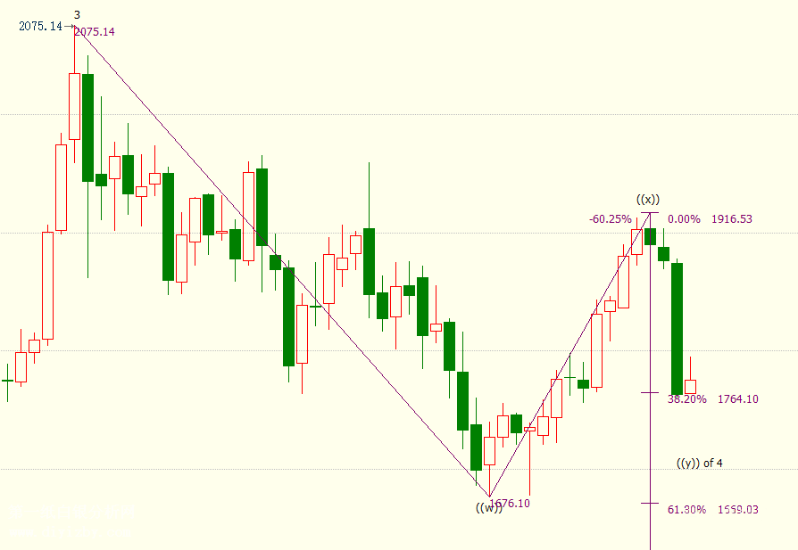 周線上看來,現貨黃金正處于自1917美元開啟的下行((y))浪,當前已經到達38.2%目標位1764美元,下方支撐看向61.8%目標位1670美元。((y))浪是自2075美元開啟的調動4浪的子浪。