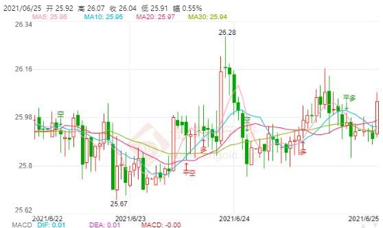 周三(6月30日),現貨白銀開始連續上漲。今天白銀開盤價為25.93美元/盎司,最高為26.07美元/盎司,最低為25.88美元/盎司。截至記者發稿,白銀價格為26.02美元/盎司,上漲0.34%。
