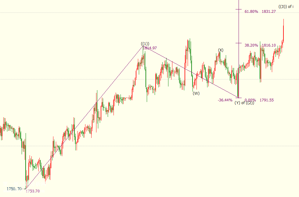 小時(shí)圖上來觀察,金價(jià)自1792美元開啟上行((3))浪走勢(shì),料升破61.8%目標(biāo)位1831美元,并且進(jìn)一步挑戰(zhàn)76.4%目標(biāo)位1841美元。((3))浪是從1751美元開啟的上行i浪的子浪。