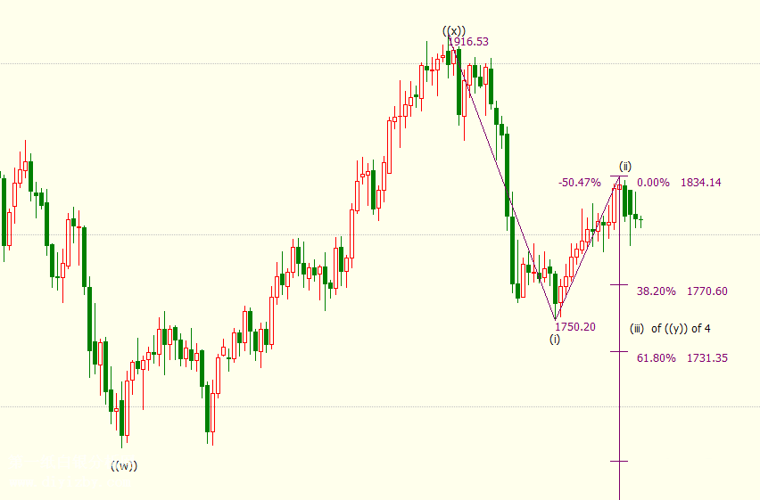 在日線圖上,金價從1834美元開始向下(III)波走勢,再次跌破1800美元。預計未來將探索38.2%和1771美元的目標(III)該波是從1917美元開始的向下((y))波的子波,該波是自2075美元調整后的4個波的子波。