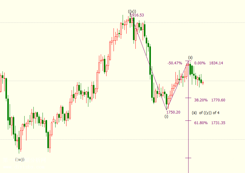 日線圖上看得出,金價(jià)從1834美元開始下行(iii)浪走勢,后市料下探至38.2%目標(biāo)位1771美元和61.8%目標(biāo)位1731美元。(iii)浪是自1917美元開啟的下行((y))浪的子浪。((y))浪則是自2075美元開啟的調(diào)整4浪的子浪。