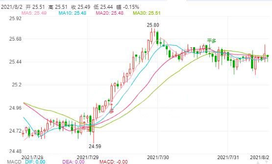 價格在短期內下跌,低于先前的高點25.8。如果價格繼續下跌,短期或測試斐波那契23.6%的修正位置將由25.49支撐。跌破之后,市場前景可能進一步回落至斐波那契38.2%的回調水平25.3。如果價格上漲,我們需要關注日內交易的2/1甘斯線,或短期測試25.8的阻力,突破后將進一步上漲。