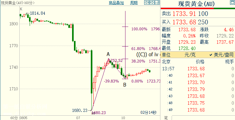 在每小時圖表上,黃金價格自1724美元以來一直處于上升((c))波,上限阻力期待著38.2%的目標1751美元((c))波是自1680美元以來上升第四波的子波,第四波屬于第三波。