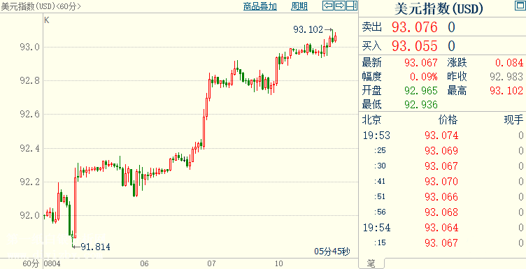 美國指數創下7月21日以來新高,至93.102。黃金在過去兩個交易日下跌4%,創下自周一3月31日以來的新低點1690.61美元。
