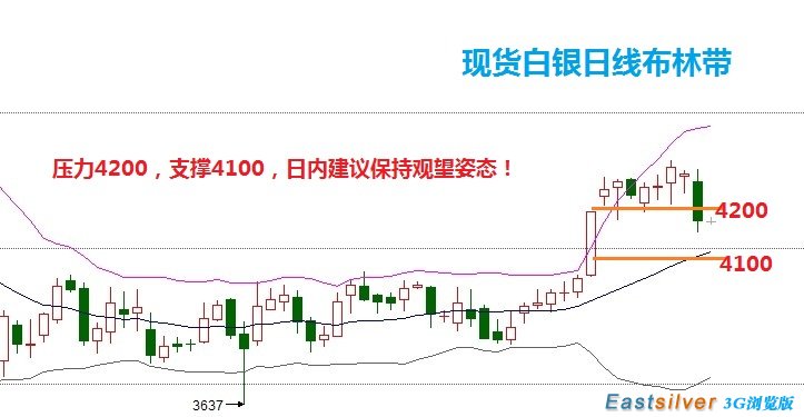 今日策略:現貨白銀昨日表現為大幅下跌走勢,日K線收紡錘體長陰,截止到今日早盤為止銀價運行在4180附近,目前我們尚且無法找到昨日白銀下跌的理由,但從技術上看存在兩種可能性,其一就是主力資金的洗盤行為,尚若如此則經過快速下跌之后銀價還會回歸到上行走勢中,其二就是多頭趨勢的反轉,尚若如此則銀價會進一步下行,雖然我們更傾向于第一種可能性,但是在獲得充足的證據之前,我們建議投資者先保持觀望姿態,日內參考交易計劃如下: