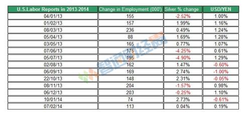 白銀價格走勢改變了方向并且在上個周開始出現下跌。那么白銀市場短期會出現什么樣的情況呢?讓我們來看一下最近可能會對白銀價格產生影響的新聞。 最近白銀價格的下跌反應了在白銀ETFs中需求的下降,例如:白銀信托。在上個周,白銀信托價格下降了3個百分點。白銀相關方面的投資例如Silver Wheaton (SLW)同樣在上周下跌了1.2個百分點。著眼未來,美元的上漲,黃金價格還有美國經濟的發展都可能會對白銀的價格產生影響。讓我們進一步探討一下這些問題吧。 這周美國非農就業數據將會發布。這些報告似乎對白銀價格短期會產生影響。在前一份報告中,只有111300份工作在一月份被創造,而這一數據是在預測的數據之下。下表顯示的就是白銀價格的變化還有美元兌日元以及就業方面增長的關系。
